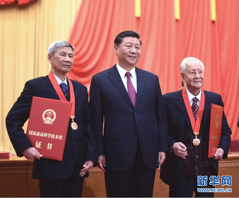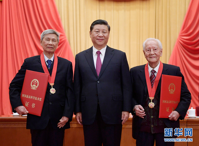 1月10日,2019年度国家科学技术奖励大会在北京人民大会堂隆重举行。中共中央总书记、国家主席、中央军委主席习近平向获得2019年度国家最高科学技术奖的原中国船舶重工集团公司第七一九研究所黄旭华院士(右)和中国科学院大气物理研究所曾庆存院士(左)颁奖。 新华社记者 谢环驰 摄