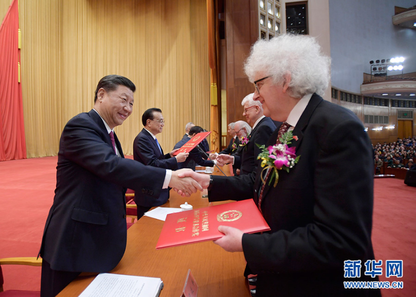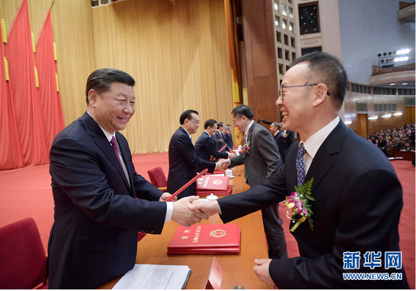 1月10日,2019年度国家科学技术奖励大会在北京人民大会堂隆重举行。这是中共中央总书记、国家主席、中央军委主席习近平向获奖代表颁发证书。 新华社发(盛佳鹏 摄)