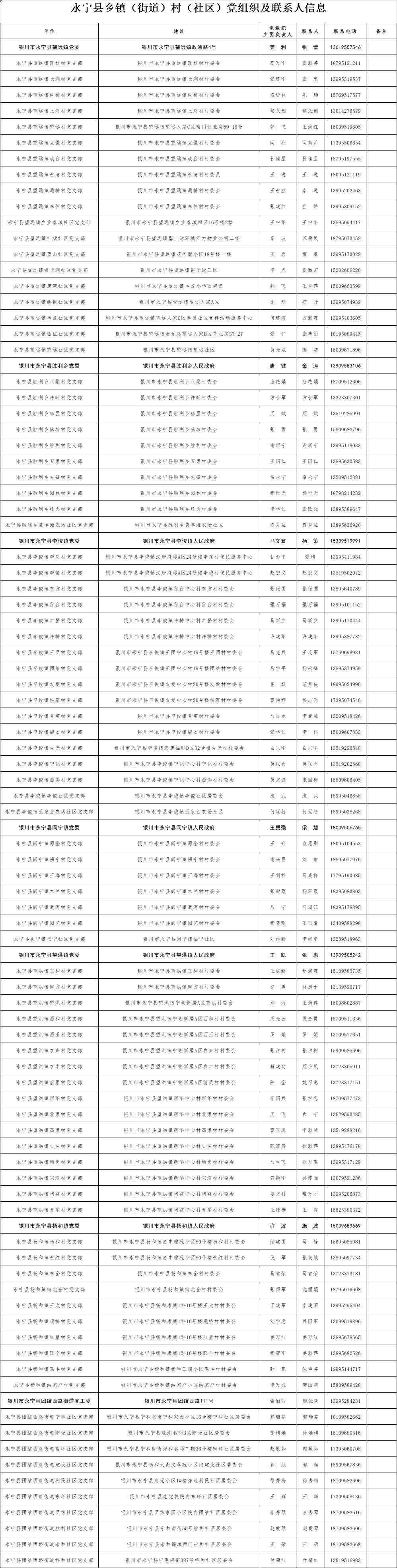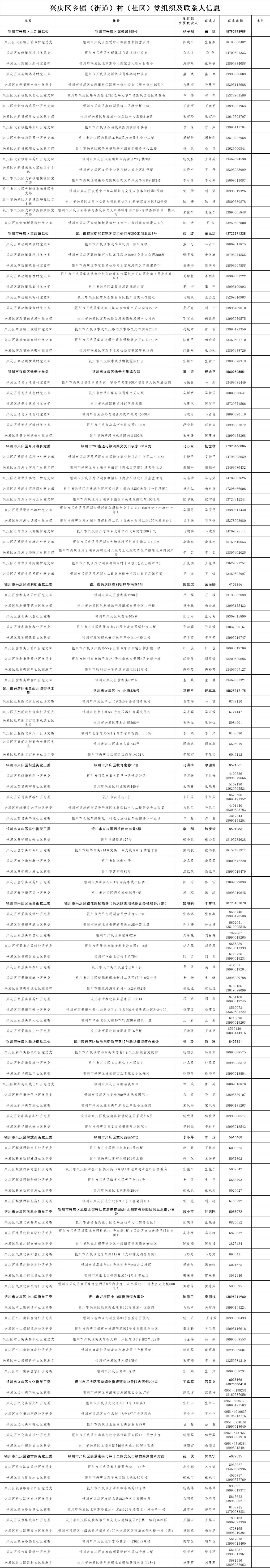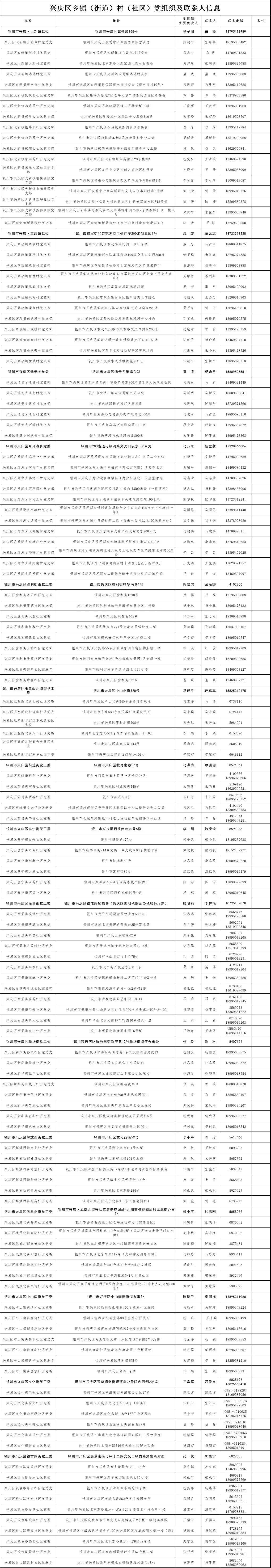 为了全面落实以村、社区防控为主的新型冠状病毒感染的肺炎疫情综合防控措施,方便外地来银人员申报登记,做到“早发现、早报告、早隔离、早诊断、早治疗”,防止疫情输入、蔓延,控制疾病传播,现将全市乡镇(街道)、村(社区)党组织联系方式和地址信息面向社会进行公布。如果需要申报登记,请按照公布的联系方式和地址信息与当地乡镇(街道)、村(社区)党组织相关负责人取得联系。