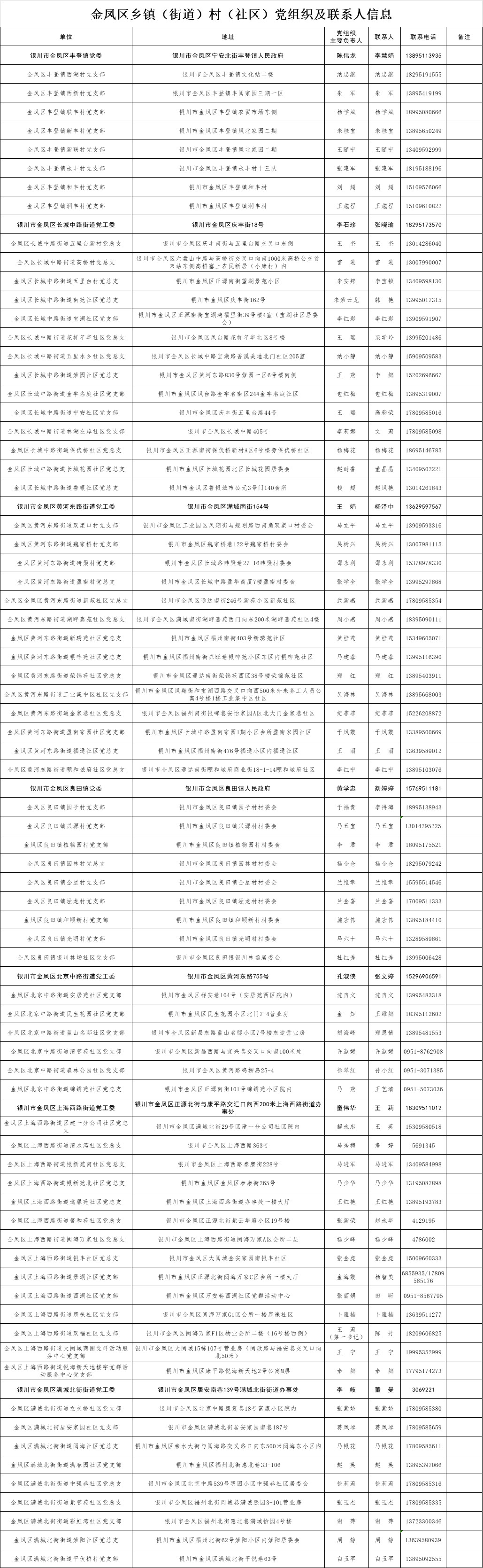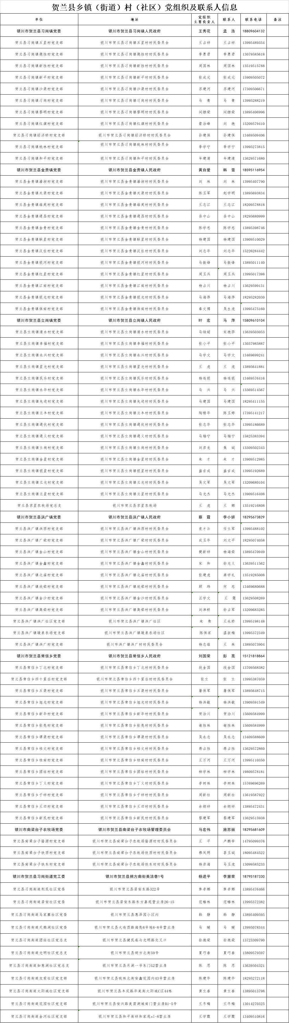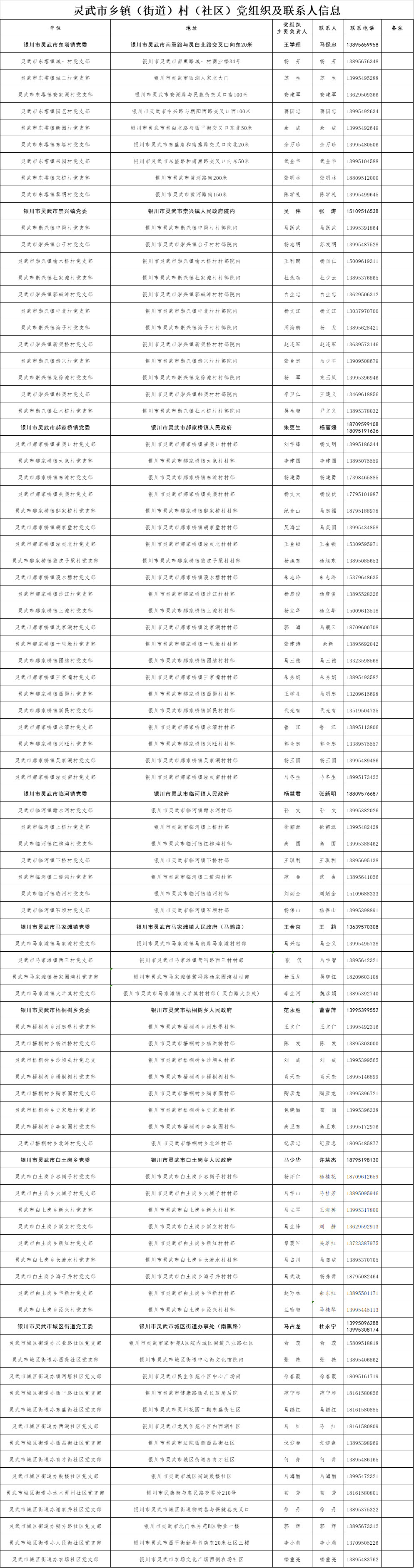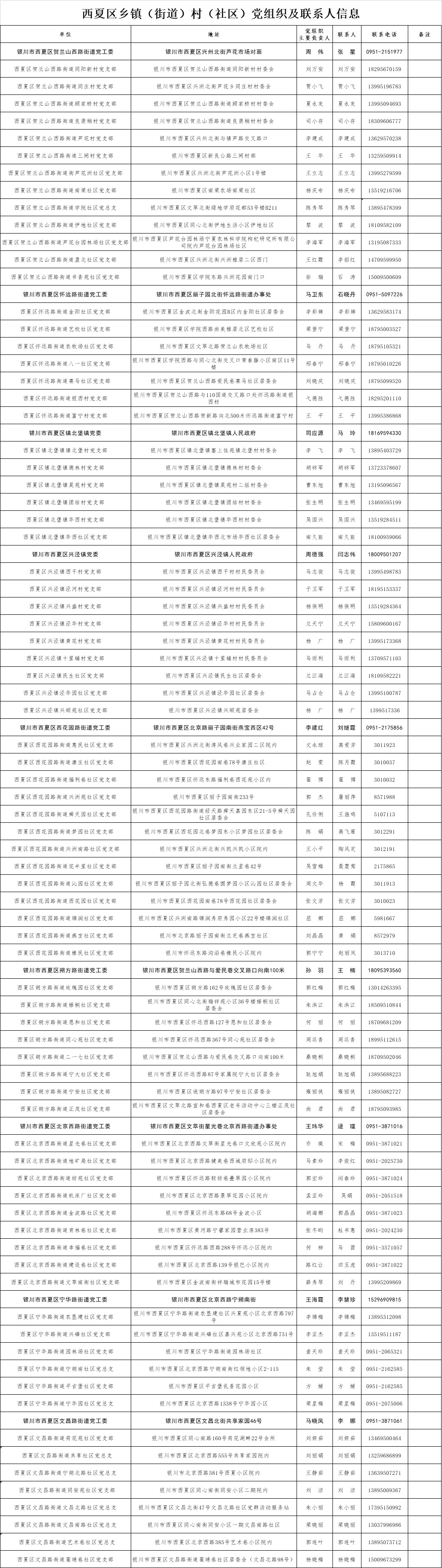 为了全面落实以村、社区防控为主的新型冠状病毒感染的肺炎疫情综合防控措施,方便外地来银人员申报登记,做到“早发现、早报告、早隔离、早诊断、早治疗”,防止疫情输入、蔓延,控制疾病传播,现将全市乡镇(街道)、村(社区)党组织联系方式和地址信息面向社会进行公布。如果需要申报登记,请按照公布的联系方式和地址信息与当地乡镇(街道)、村(社区)党组织相关负责人取得联系。